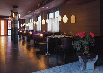 Das Interior bewegt sich zwischen französischer Raffinesse und asiatischer Zurückhaltung. Unterschiedliche Bereiche strukturieren den Raum auf natürliche Weise: eine Lounge im vorderen Bereich, die zum Verweilen einlädt, ein lebendiger Barbereich sowie eine offen inszenierte Sashimi- und Austern-Theke. Dahinter öffnen sich weitere Zonen mit verschiedenen Sitzlandschaften – von klassischen Bänken und Tischen bis hin zu einem intimeren Séparée.